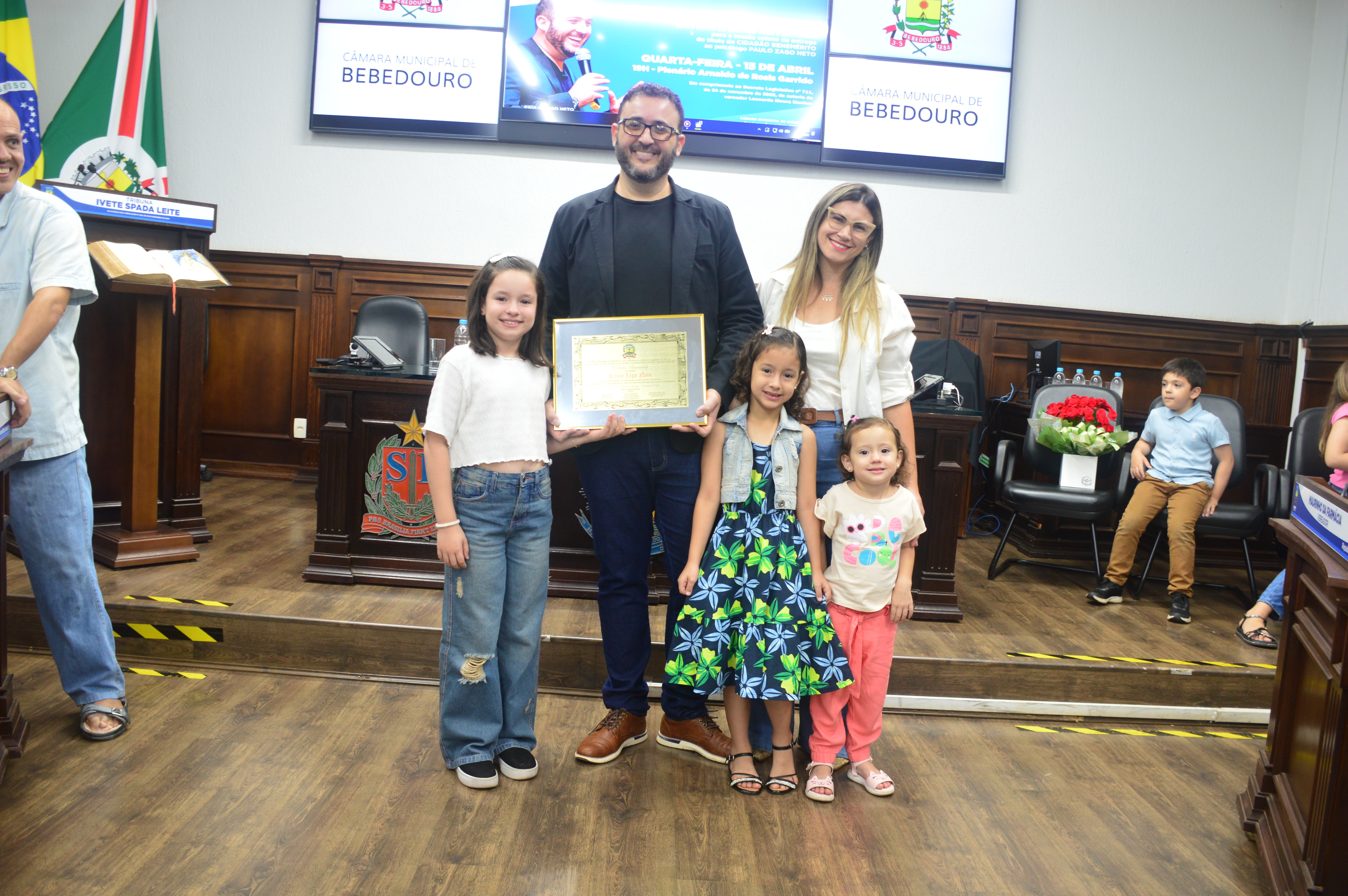 Além do vereador Léo Munhoz, a sessão solene de premiação contou com as presenças da vereadora Dra. Ivanete Xavier (PSD), do vereador Maurinho da Farmácia (Republicanos), e de familiares e amigos do homenageado.