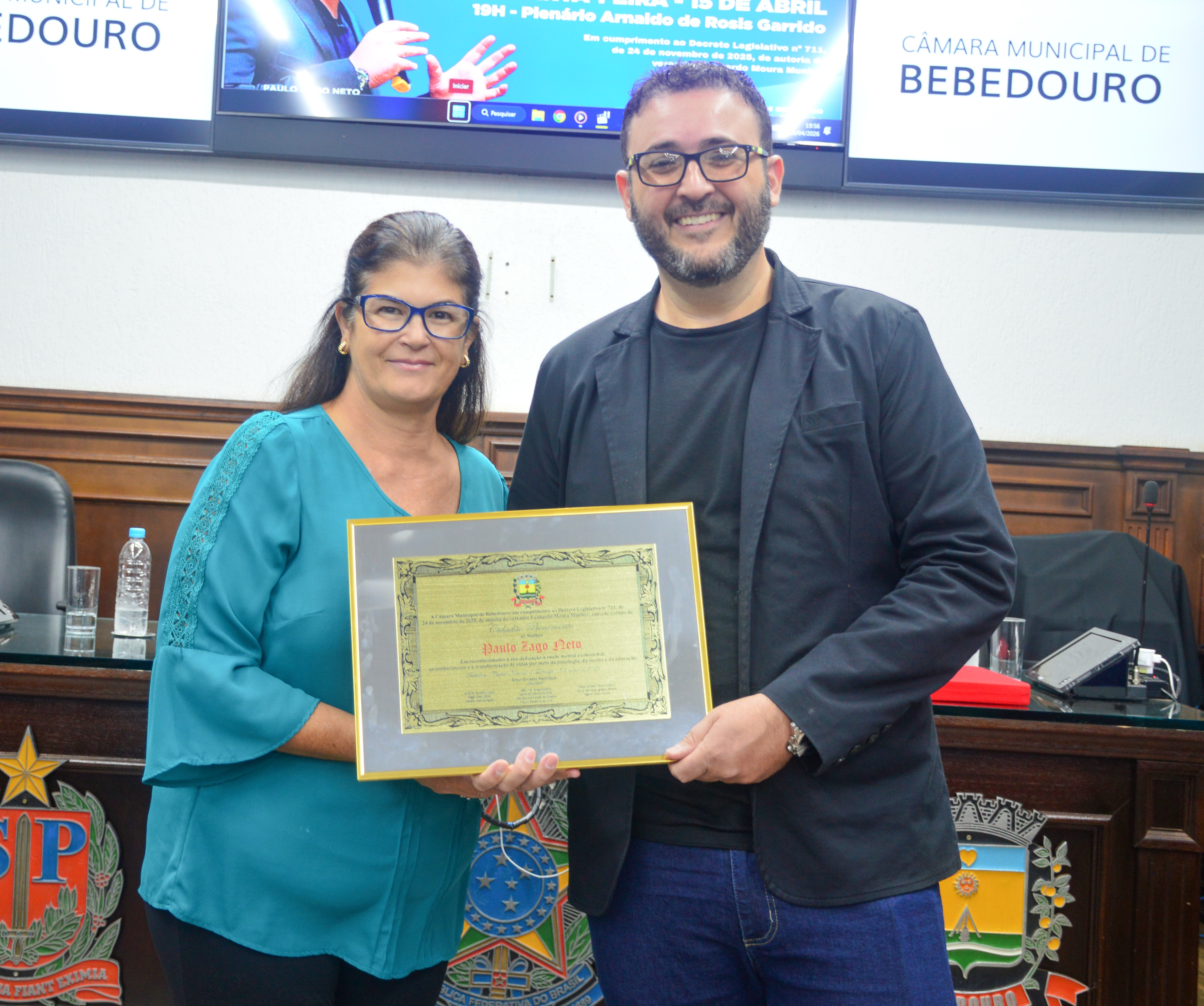 A Câmara Municipal de Bebedouro realiza, nesta quarta-feira (15), às 19h, a sessão solene de entrega do título de Cidadão Benemérito ao psicólogo Paulo Zago Neto. A honraria é destinada a cidadão...
