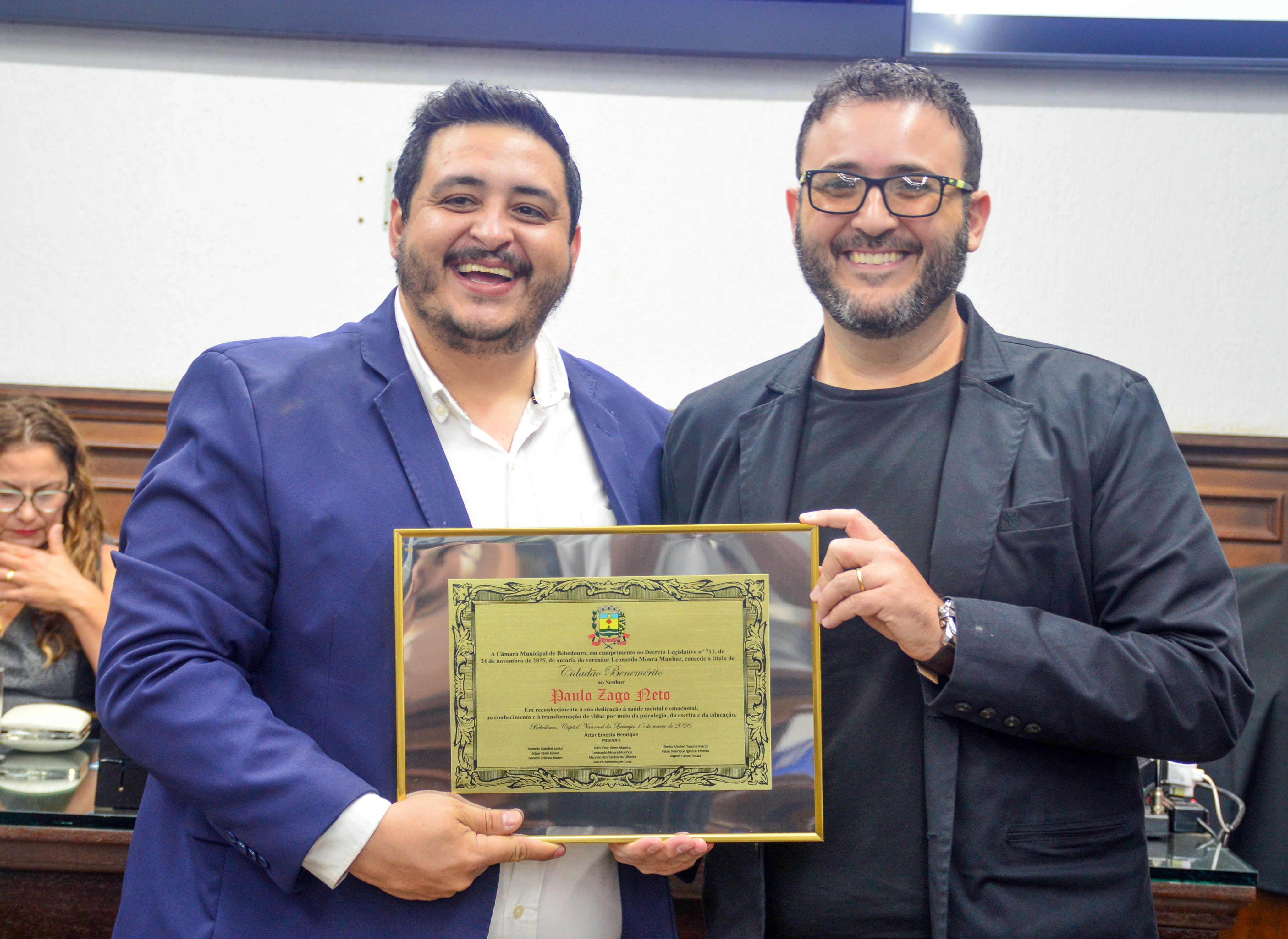 A homenagem foi proposta pelo vereador Léo Munhoz (Podemos). A atuação social de Neto Zago, como é mais conhecido, estende-se para além do consultório. Ele, que é natural de Bebedouro, idealizou e coordena projetos de impacto comunitário, como o DepreNão, focado na prevenção e tratamento da depressão, entre outros.